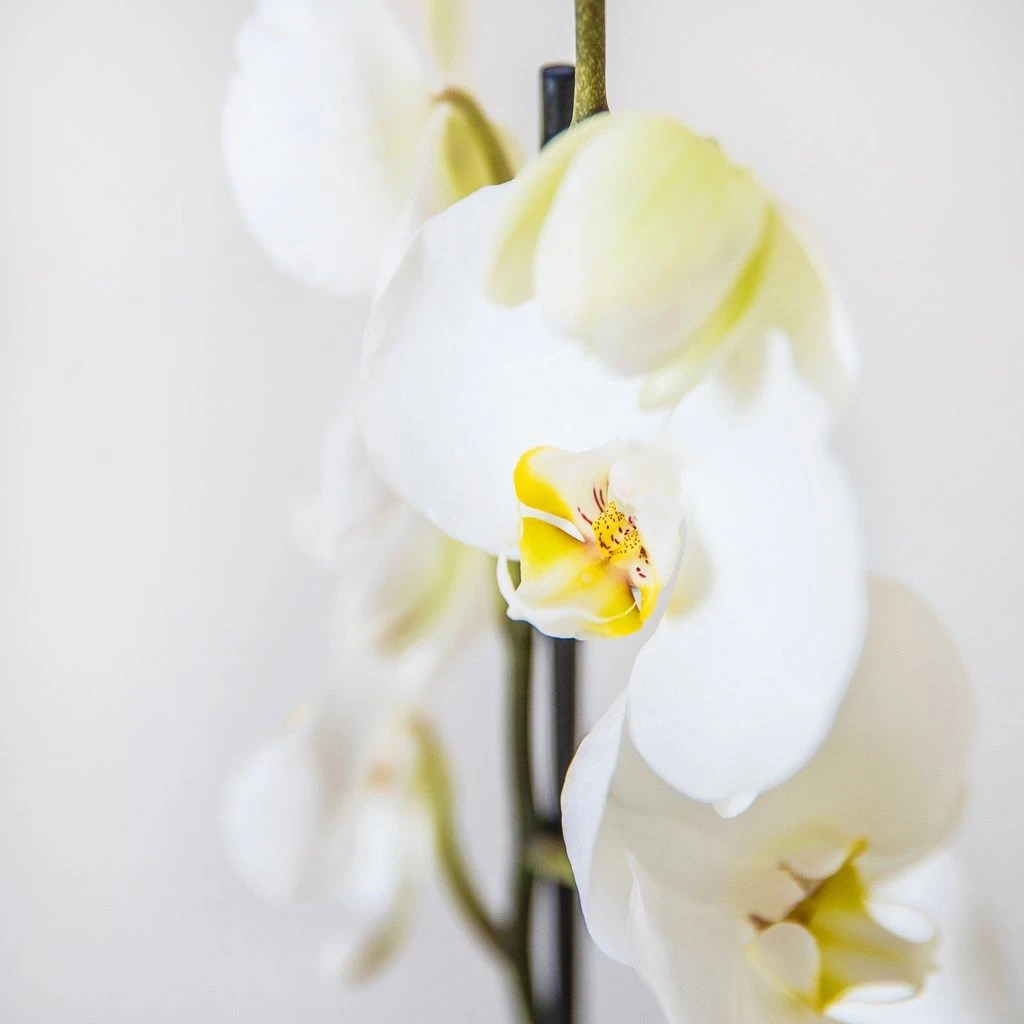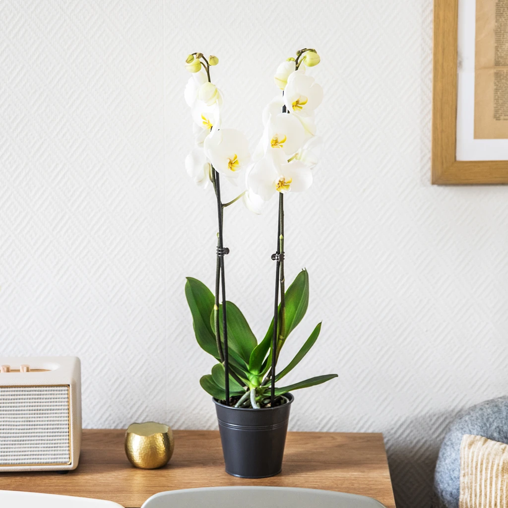 With its elegant, butterfly-like bloom, our white, two-branched phalaenopsis orchid (approx. 50 cm) invites you to convey your message in a tactful and original way. Whether your flower delivery is planned for a workplace or a home, this is a flowering plant that promises to create a beautiful and emotional surprise. Here it is accompanied by its teddy bear Harry